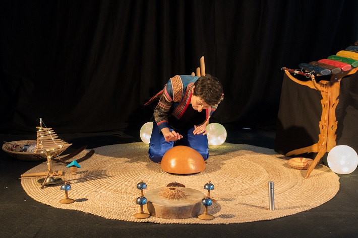 Autour d’un texte poétique, Isabelle Grenier interprète des chansons et des comptines accompagnées par divers instruments : ukulélé, ocarina, sanzas, balafon…